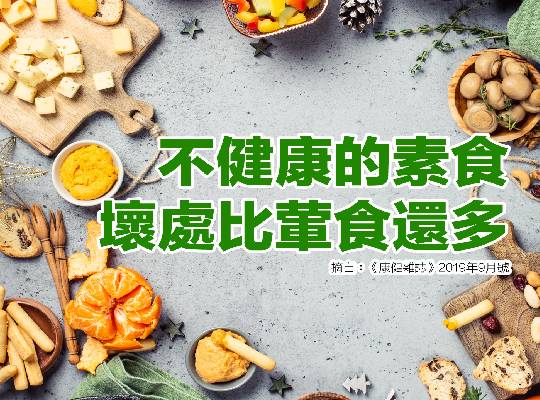 然而,許多素食的食材是加工過的食品,如:素肉、素雞、炸豆皮、炸豆腐等,不但油炸過(常因此產生反式脂肪),還添加許多「鹽」、「糖」、甚至「味精」,吃多了,不但熱量高,「高油」、「高鹽」、「高糖」容易造成肥胖、糖尿病、高血壓、與心血管疾病,這是值得注意的。