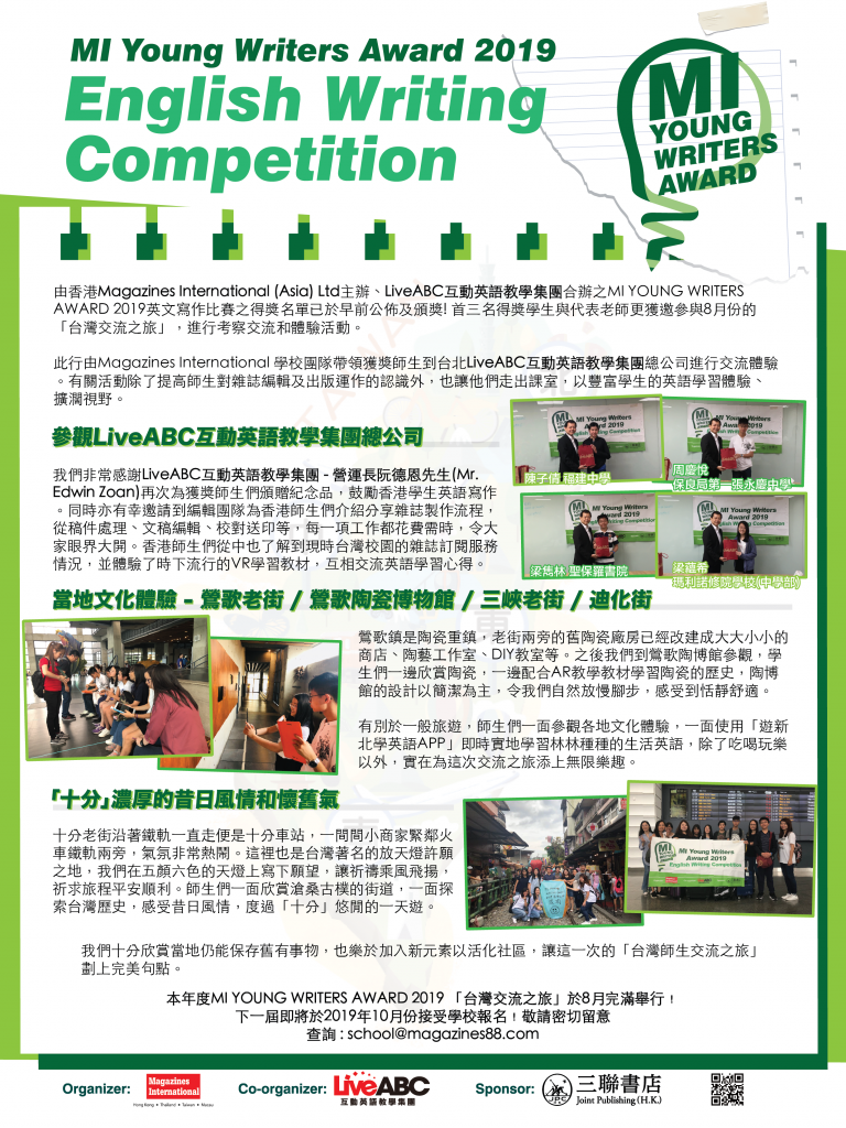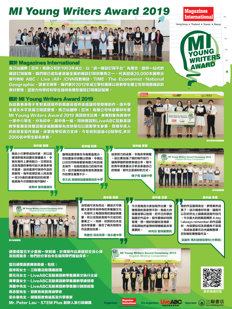 MI Young Writers Award 2019 (MIYWA) is an annual competition organized by Magazines International (Asia) Limited, one of Asia’s leading magazines subscription service provider. The competition is supported by LiveABC Interactive English Group (the official licensee of CNN news element for CNN Interactive English magazines) as the co-organizer, and sponsored by Joint Publishing (Hong Kong) Company Limited.