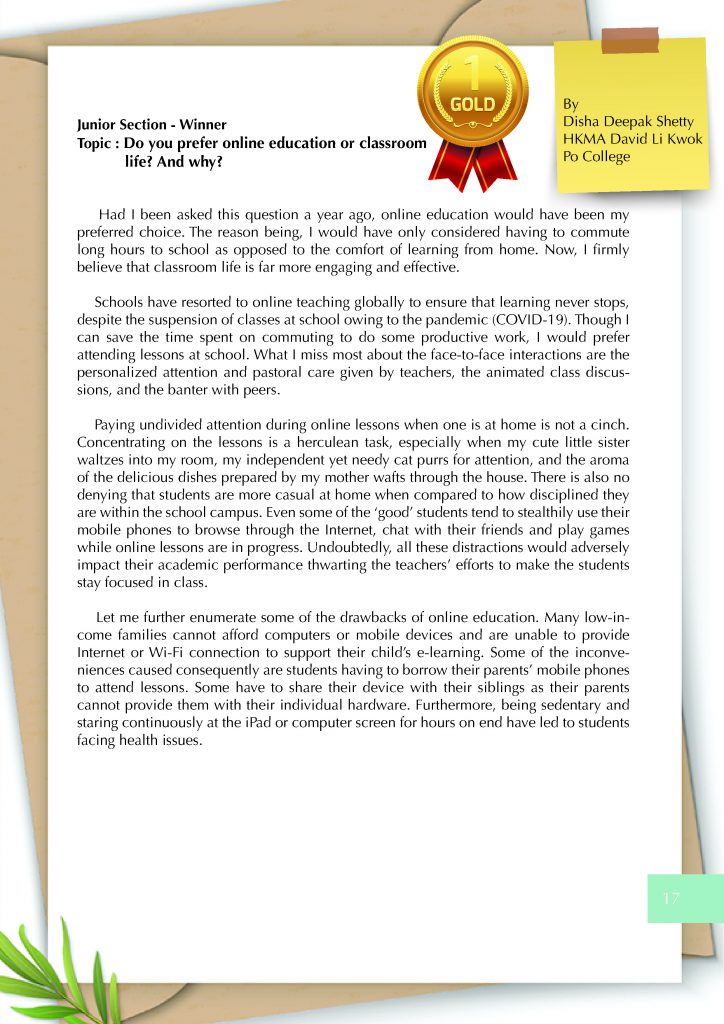 There are two sections for entry: Junior section for S1-S3 (Year 7-9) and Senior section for S.4-S.6 (Year 10-13). Each section is assigned with a topic of writing. This year, the theme for Junior section is “ I’m Happy When…” and for Senior section is “A Day I Will Always Remember”