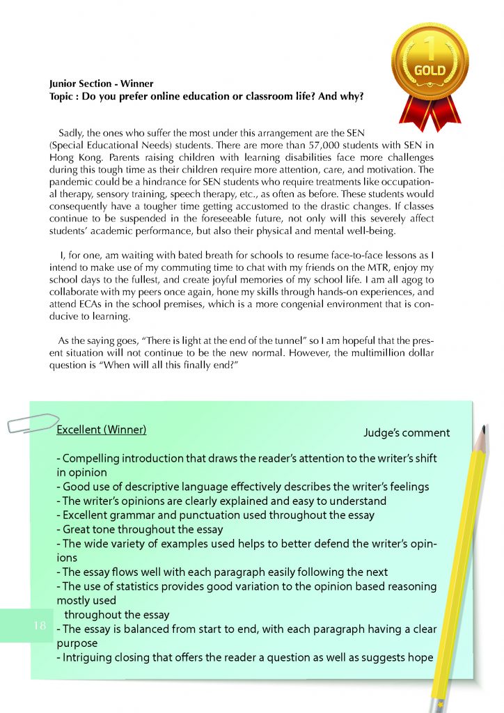 The competition’s key aim is to foster and recognize excellence in English writing by providing students with the opportunity to develop their expressive talents and creativity. The competition is opened to students of secondary schools in Hong Kong.